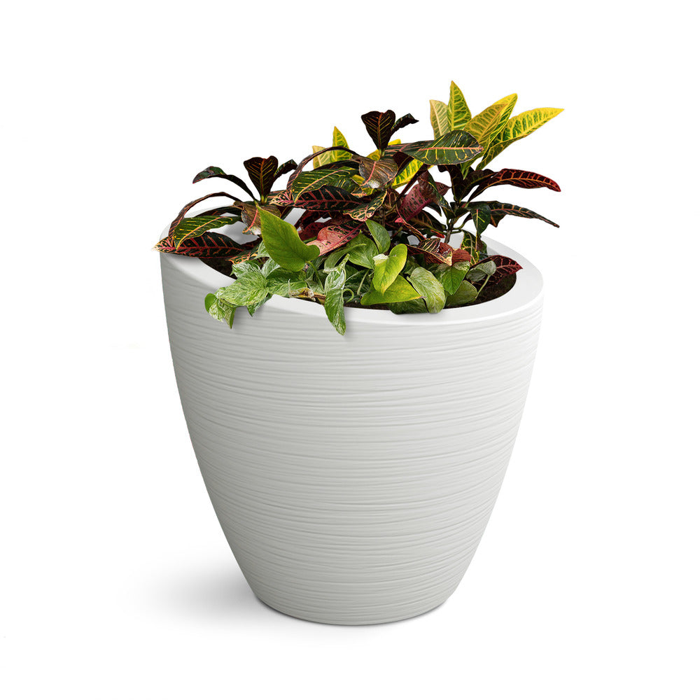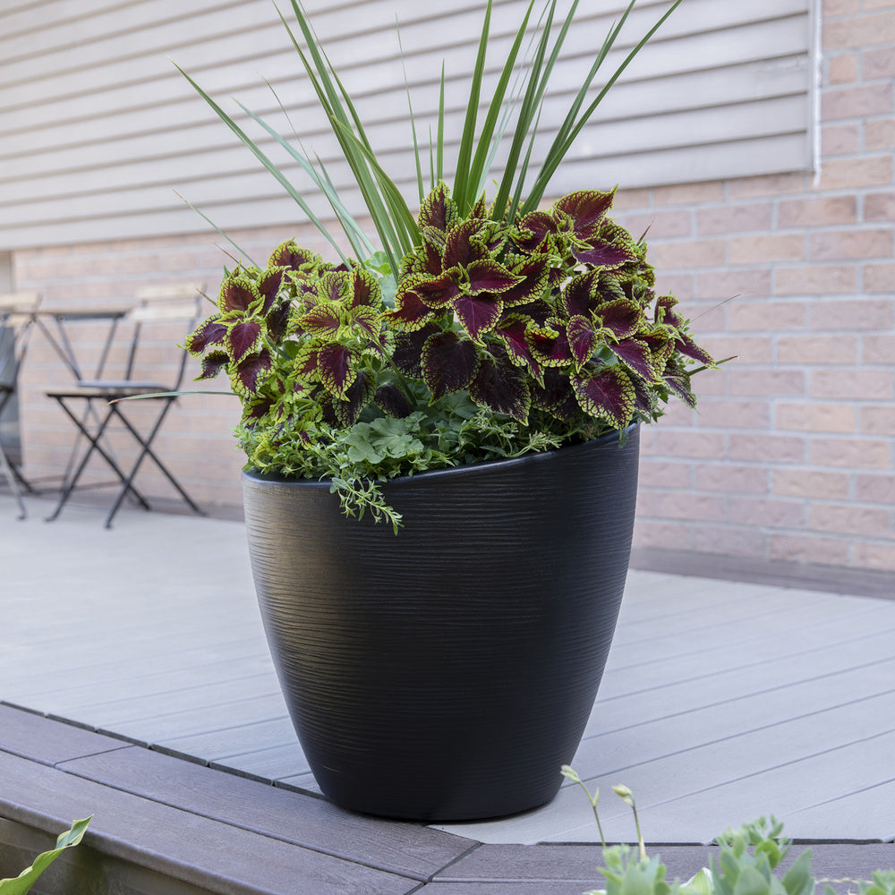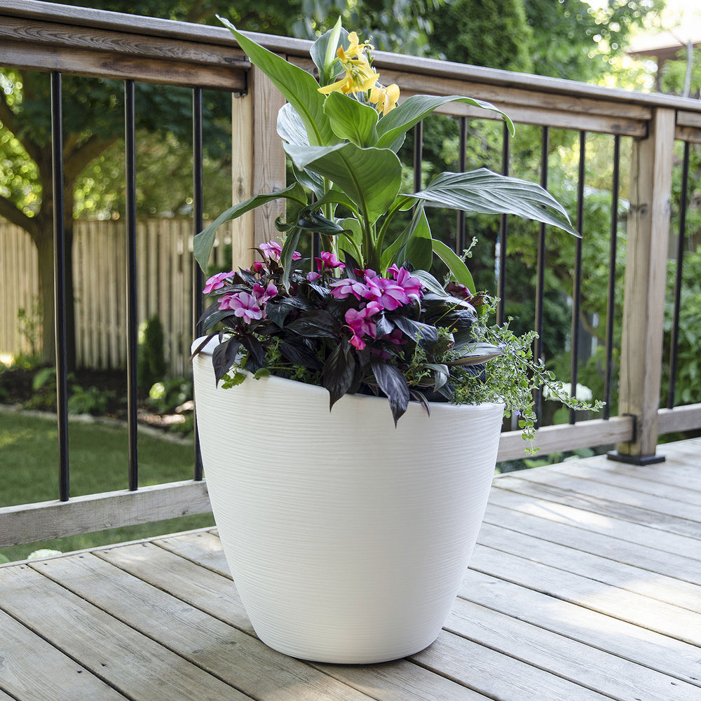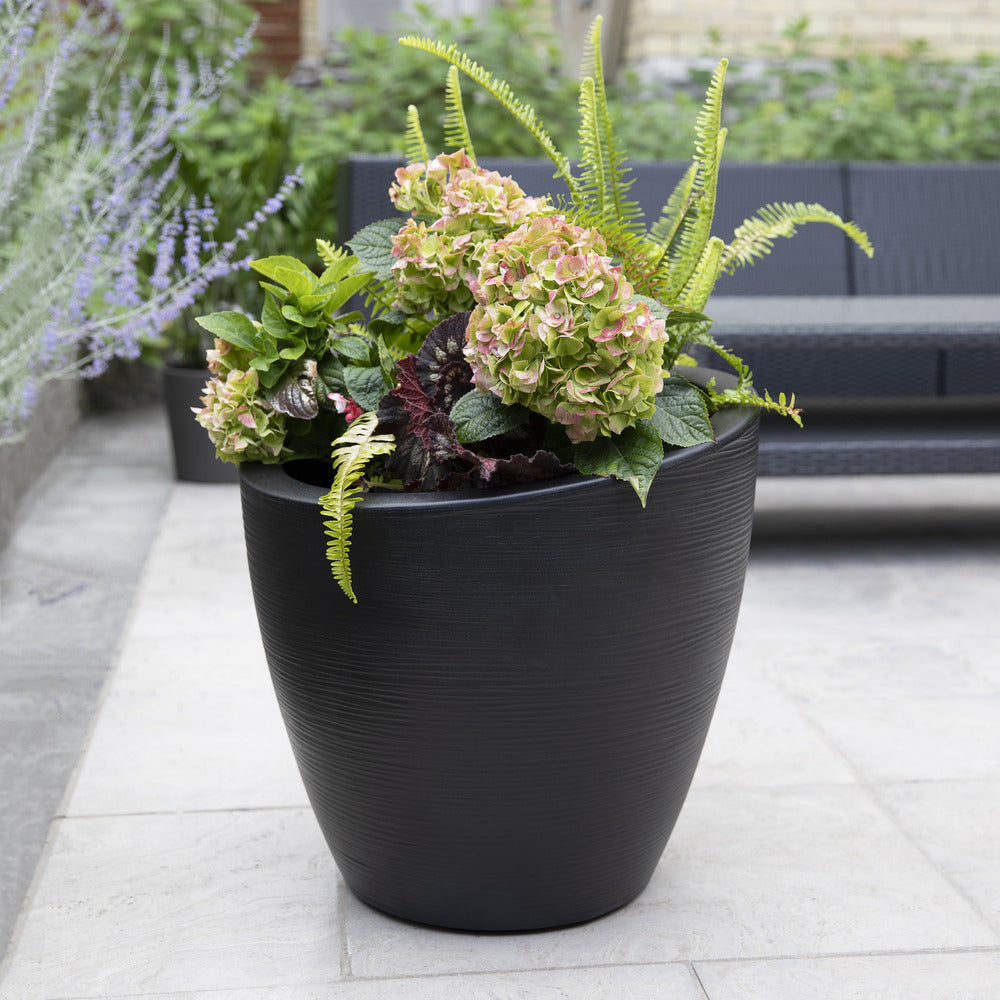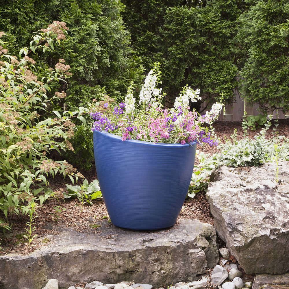 The Modesto 20in Round Planter features fade-resistant materials to maintain its refined appearance and robustness over time. Its removable plug enables a stable base that can be filled for added weight. The double-wall construction enhances stability while providing insulation against weather conditions. Tailored for year-round use, it includes a specialized drainage system to prevent water accumulation.
